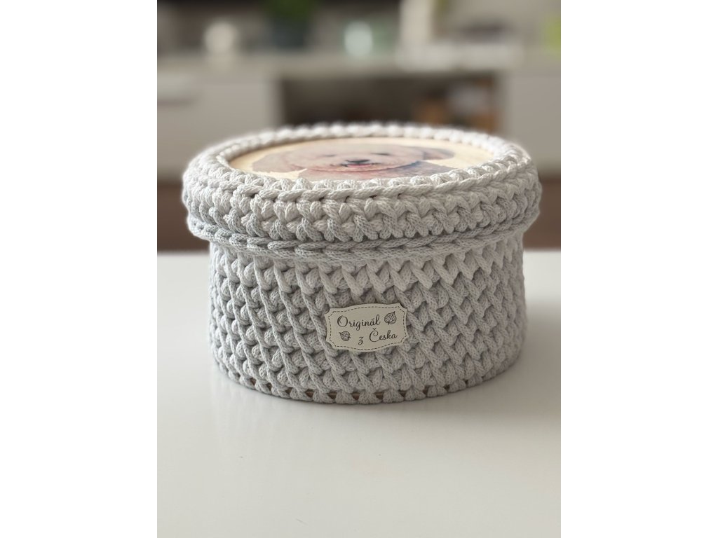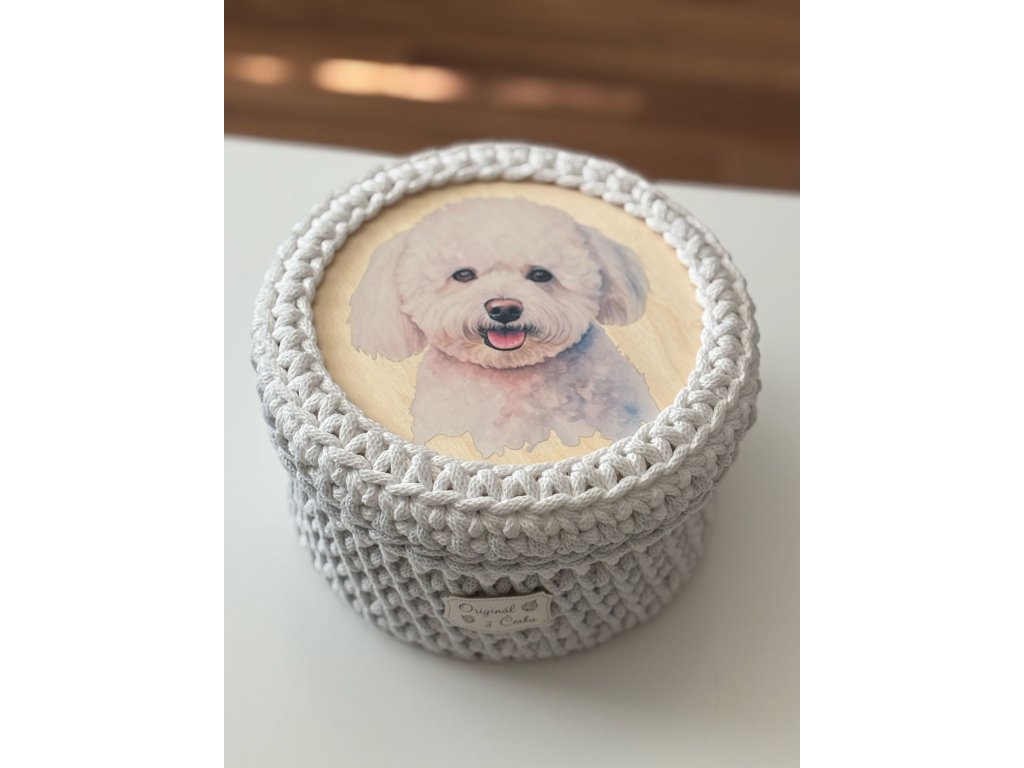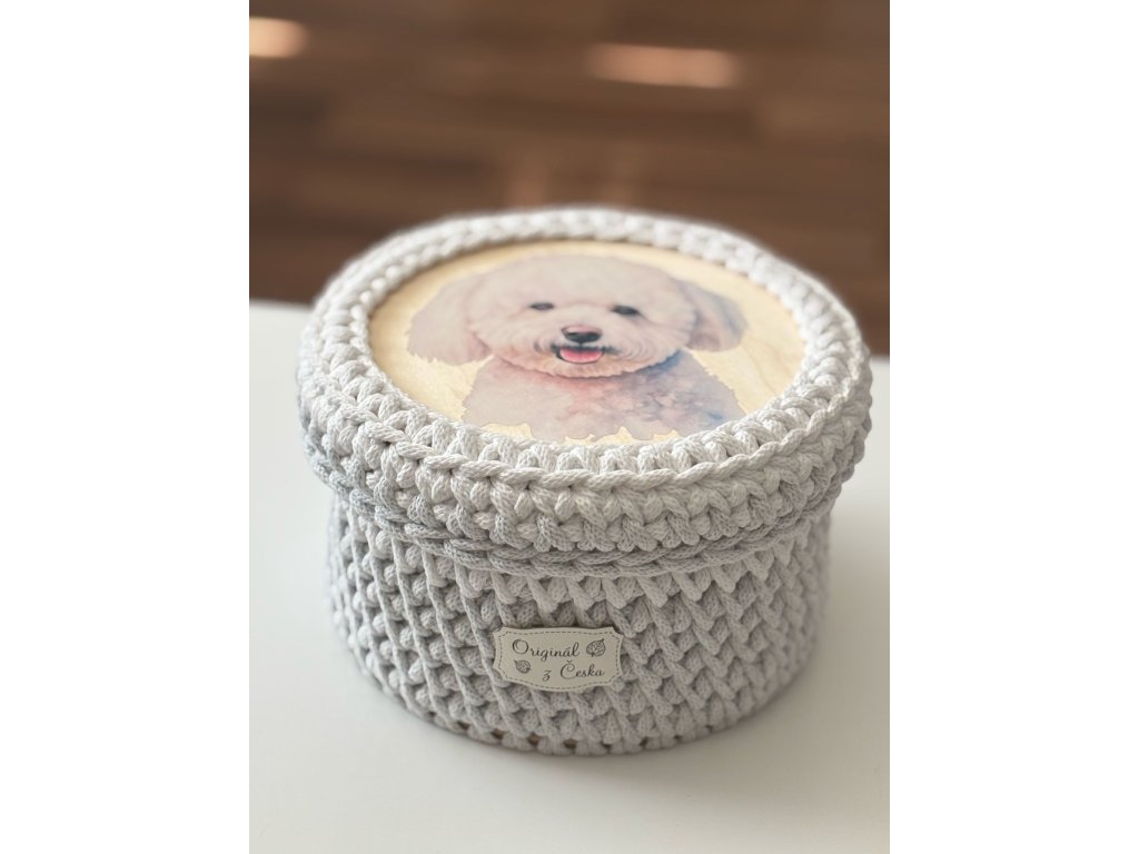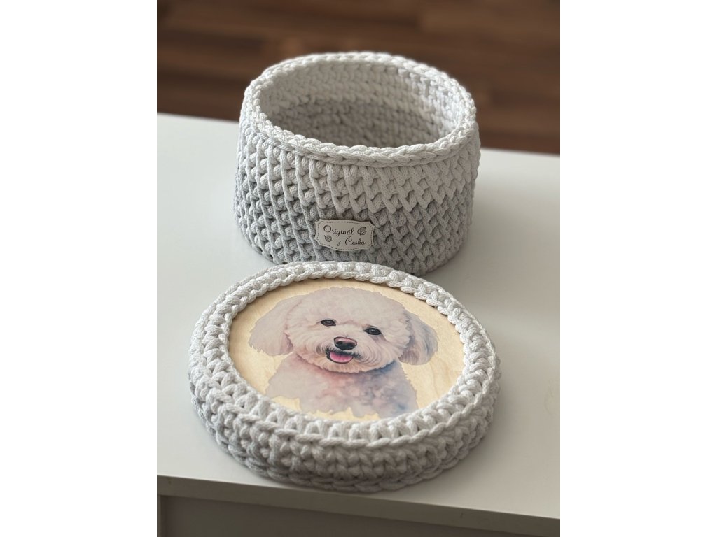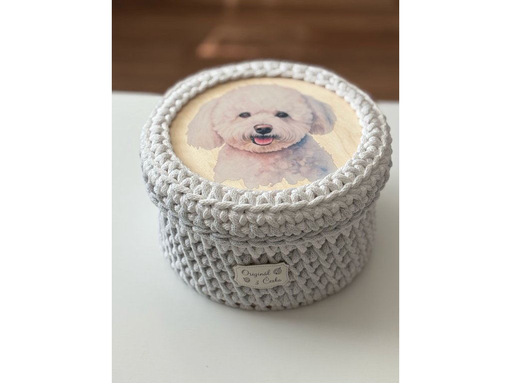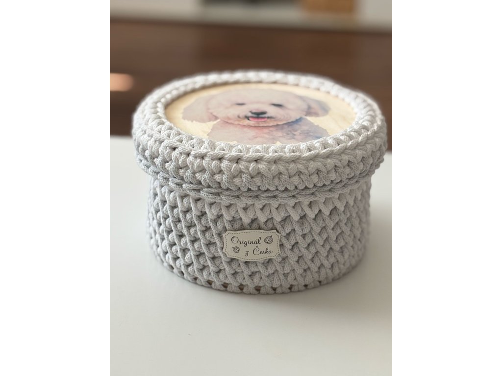 Má pevné dřevěné dno a obháčkované víko s potiskem bišonka frisé. (Lze objednat různé druhy - pro milovníky pejsků.)