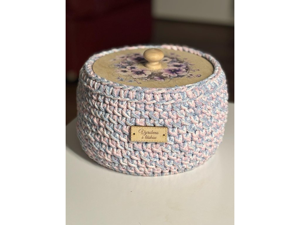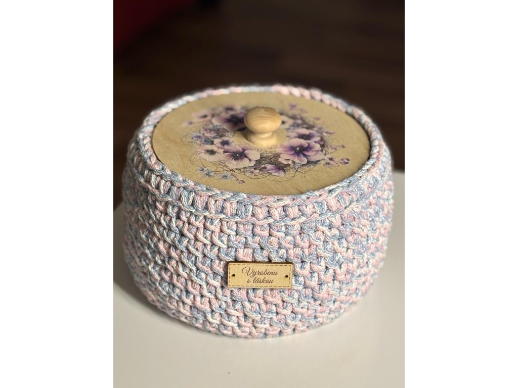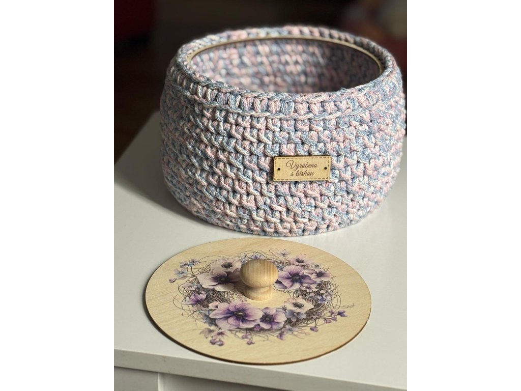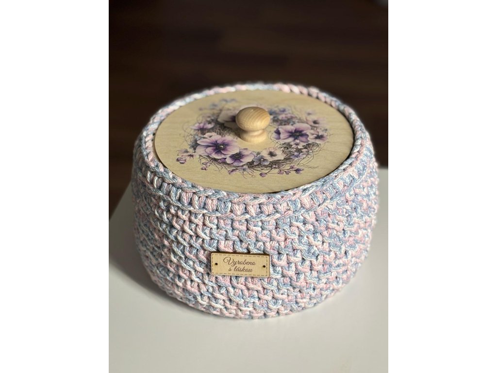 Má pevné dřevěné dno a víko s potiskem macešky a knopkou.